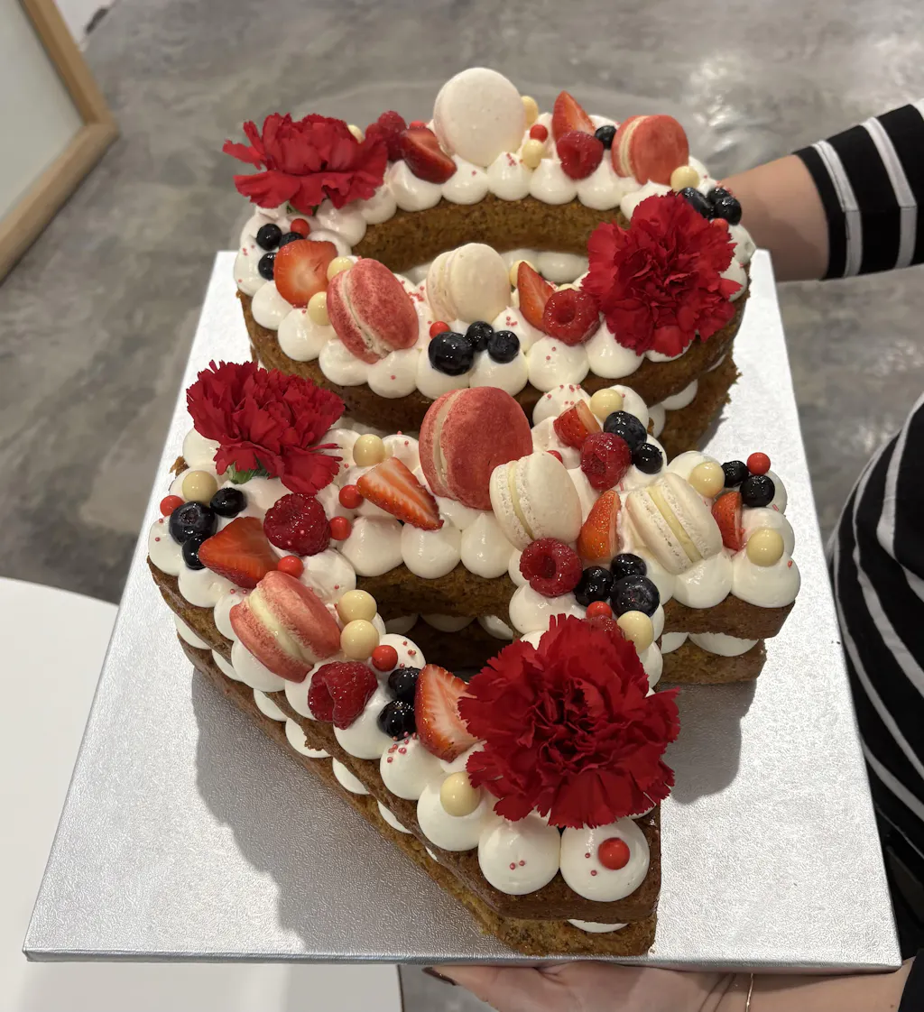CAKE NUMBER (2 units)Number cake decorated with red berries, macarons, meringues, chocolate, and a fresh flower. Please specify the number when placing your order. Approximate size: 25x14 cm per digit. Serves about 30 portions.