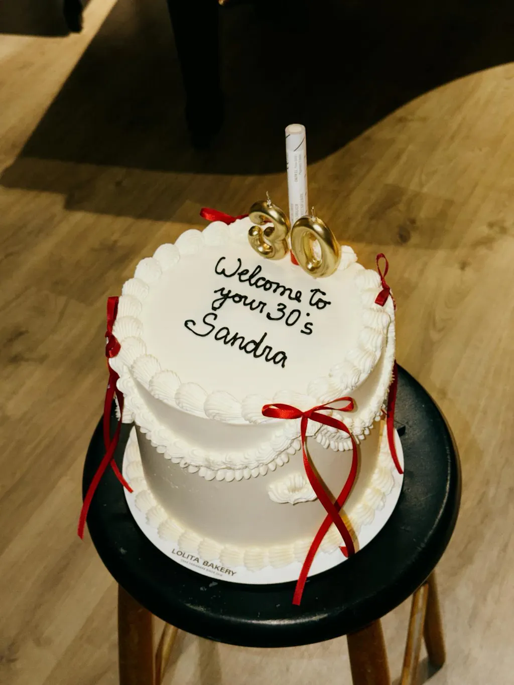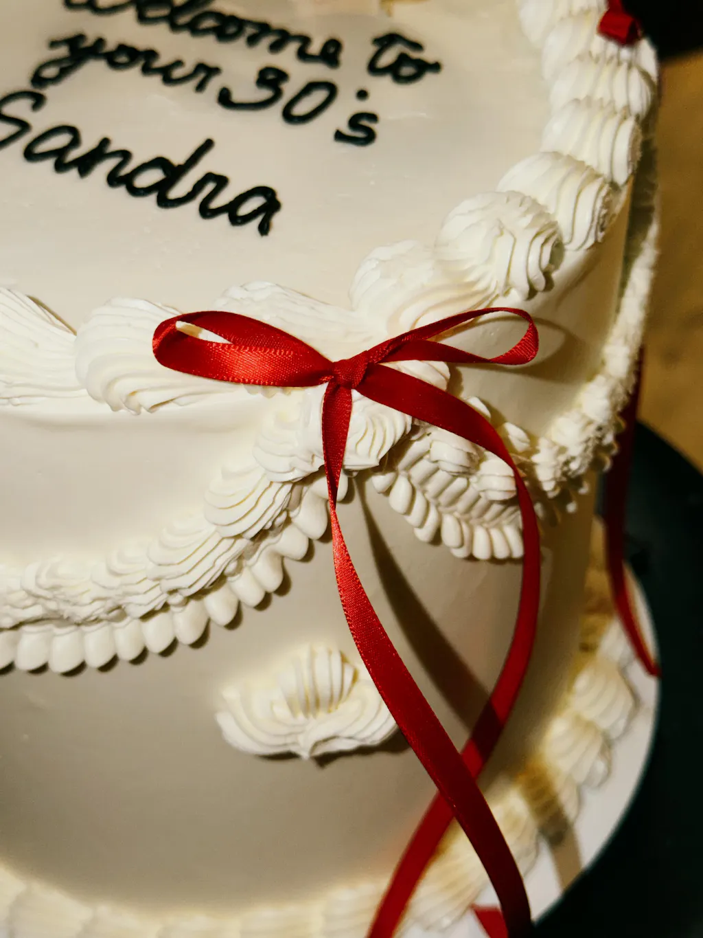 VINTAGE COQUETTE CAKE – RED BOWSVintage-style cake decorated with satin bows (black, pink, or red). A custom cake ideal for stylish celebrations in Barcelona: elegant birthdays, photo shoots, or charming themed parties.