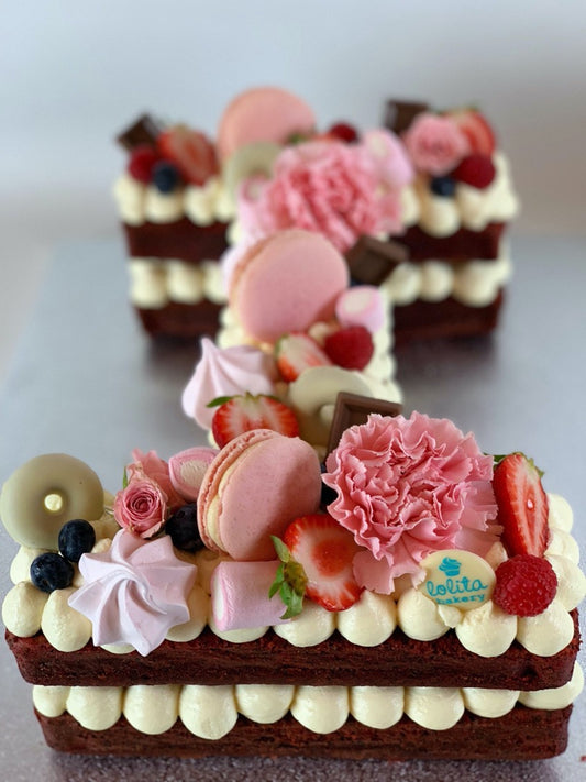 Regular priceSale priceRegular price 100.00 €Unit price / perLetter cake decorated with red berries, macarons, meringues, chocolate and natural flowers. -