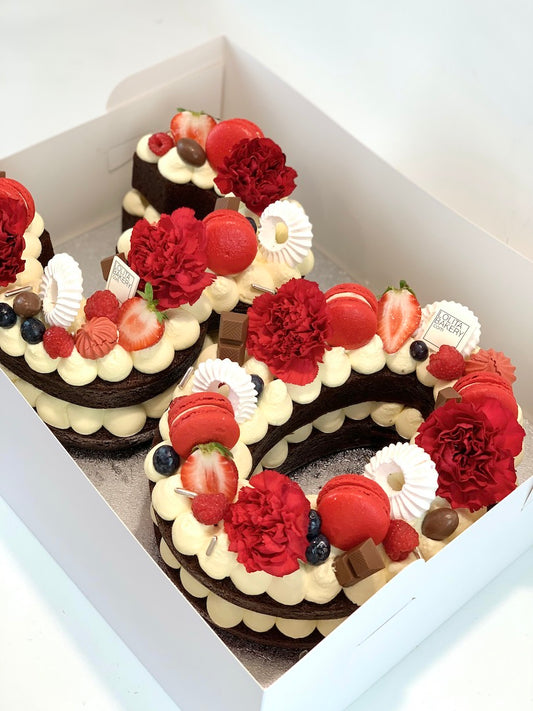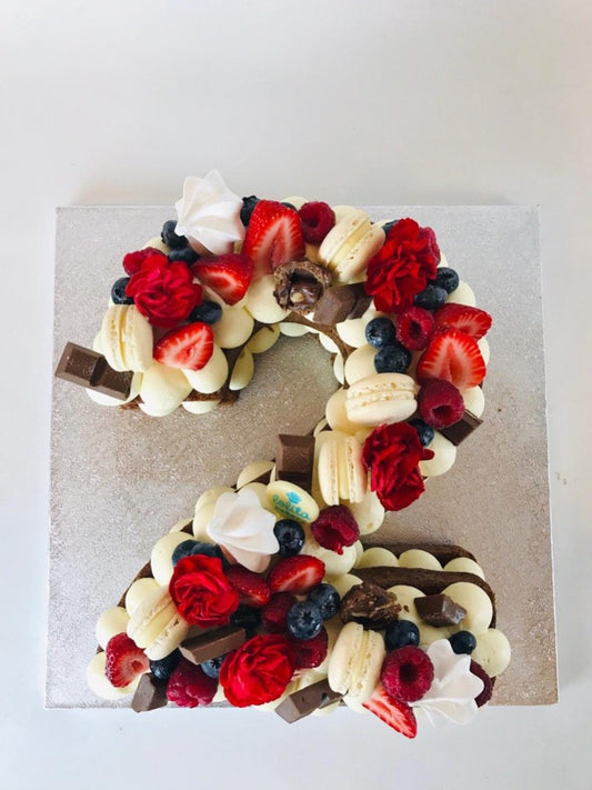 Regular priceSale priceRegular price 68.00 €Unit price / perNumber cake decorated with red berries, macarons, meringues, chocolate and natural flowers. -