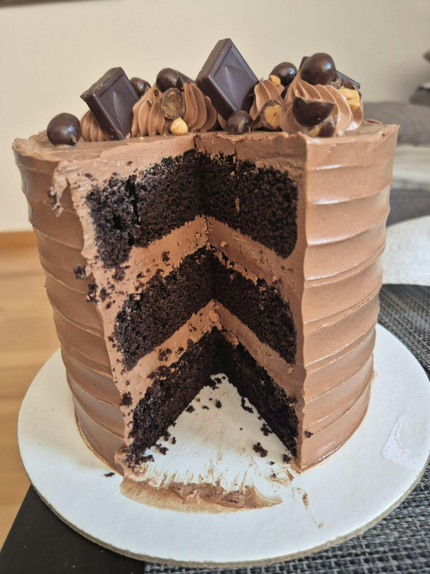 Chocolate cake with vegan chocolate cream, perfect for birthdays, celebrations, or a little indulgence. Available in various sizes and decoration options. An irresistible classic for chocolate lovers.