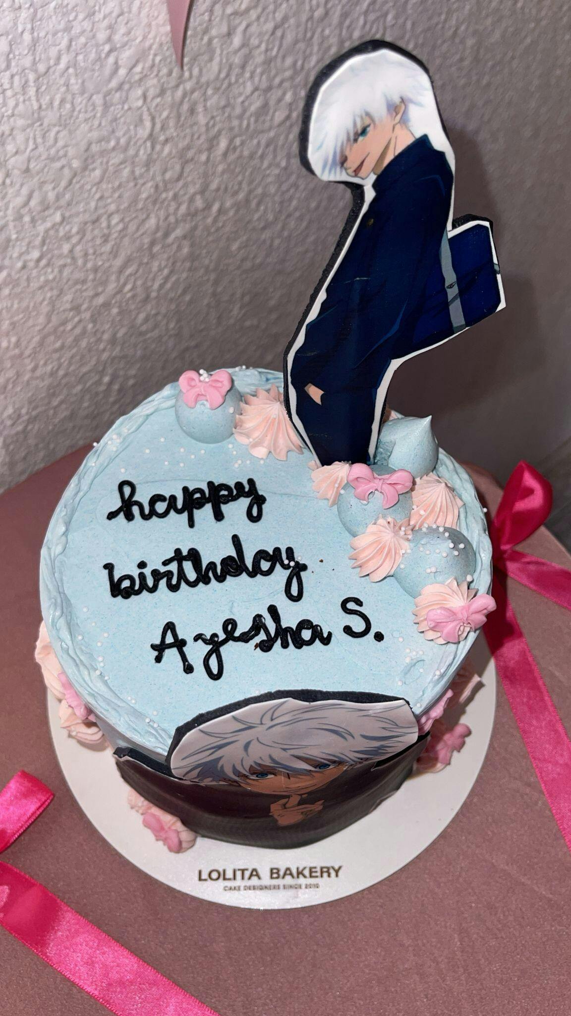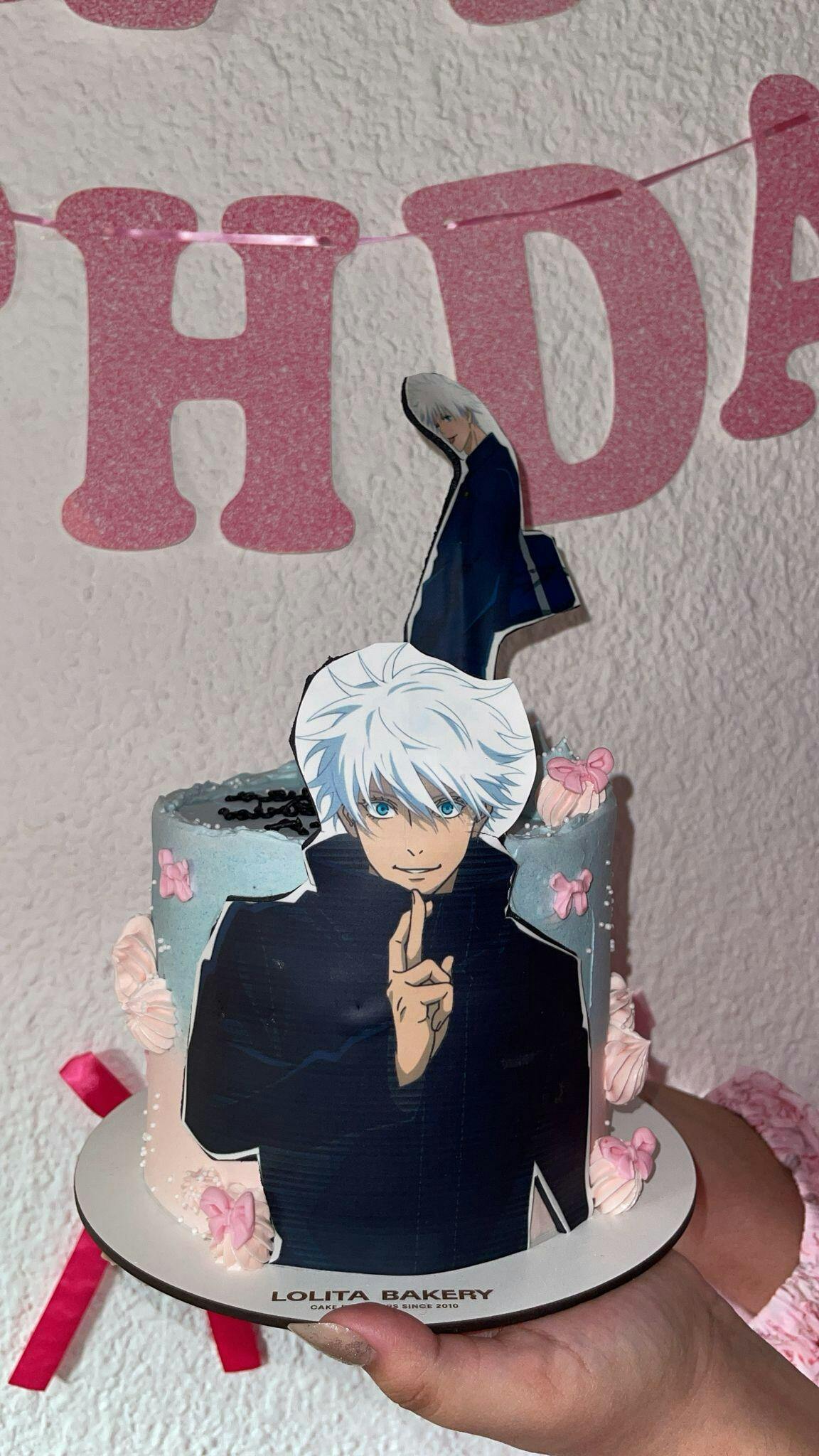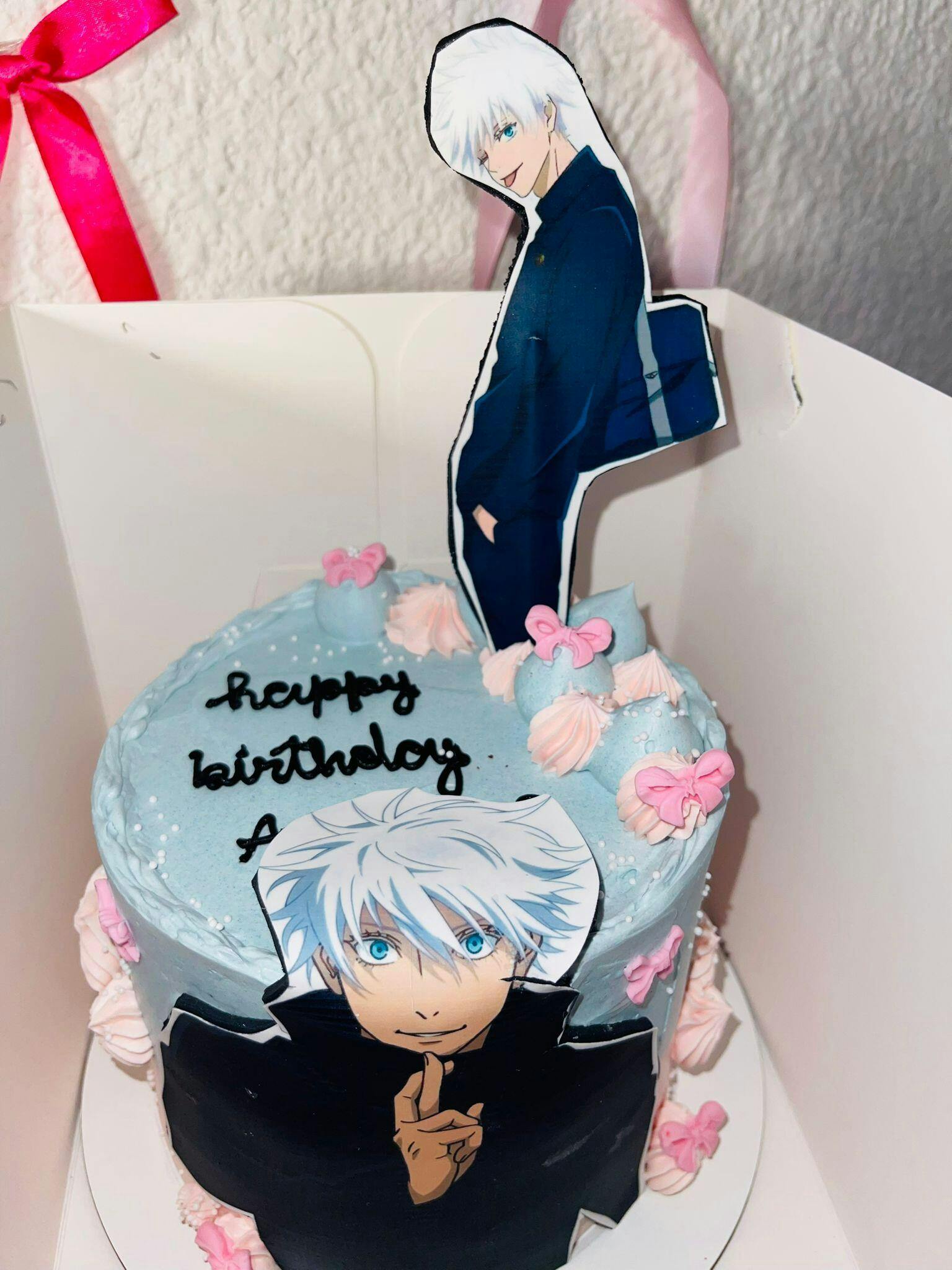 The cake was yummy 😋 and the design was also super cute ☺️ and I liked how they included all the details I asked them to do and the photos they choose were-as requested. I wanted to see gojo wihtout his blindfold and with a smile but i also wanted to be surprised so that why I didn’t send the photos myself. The only thing that disappointed me was that the shapes of gojo weren’t cut properly and that the standing gojo didn’t had a stick all the way to keep him up. Because both the photos bent over when I keep the cake out for a little while. I think putting the sticks all the way could have help prevent that.